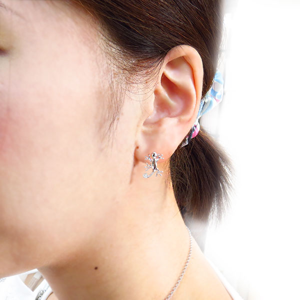 6月誕生石ロイヤルブルームーンストーンを一粒使用した10金製の可愛いヤモリモチーフピアスです。