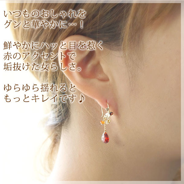 深みがあって鮮やかな赤がとても大人っぽくて目を惹くピアスです。